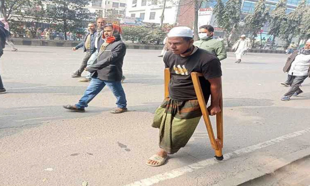 খালেদা জিয়ার জানাজার উদ্দেশে স্ক্র্যাচে ভর দিয়ে সাভার থেকে...