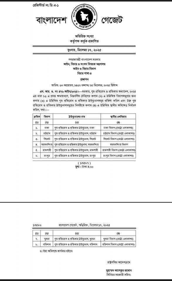সিনিয়র সহকারী সচিব আশেকুর রহমানের সই করা ওই প্রজ্ঞাপনে বলা হয়, সরকার গুম প্রতিরোধ ও প্রতিকার অধ্যাদেশ, ২০২৫ এর ধারা ১৩ এ প্রদত্ত ক্ষমতাবলে উল্লিখিত বিভাগগুলোর জন্য গুম প্রতিরোধ ও প্রতিকার ট্রাইব্যুনাল প্রতিষ্ঠা করল। এটি অবিলম্বে কার্যকর হবে।