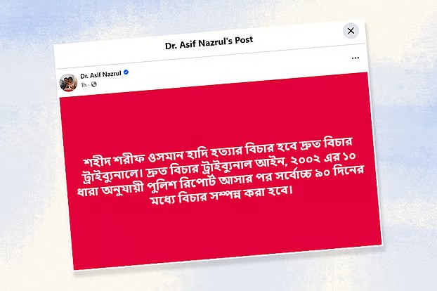 আইন উপদেষ্টা আসিফ নজরুল বলেছেন, শহীদ শরিফ ওসমান হাদি হত্যার বিচার হবে দ্রুত বিচার ট্রাইব্যুনালে। সোমবার (২২ ডিসেম্বর) দুপুর ১টা ৫০ মিনিটে আসিফ নজরুল তাঁর ভেরিফায়েড ফেসবুক পেজে দেওয়া এক পোস্টে এ কথা বলেন।